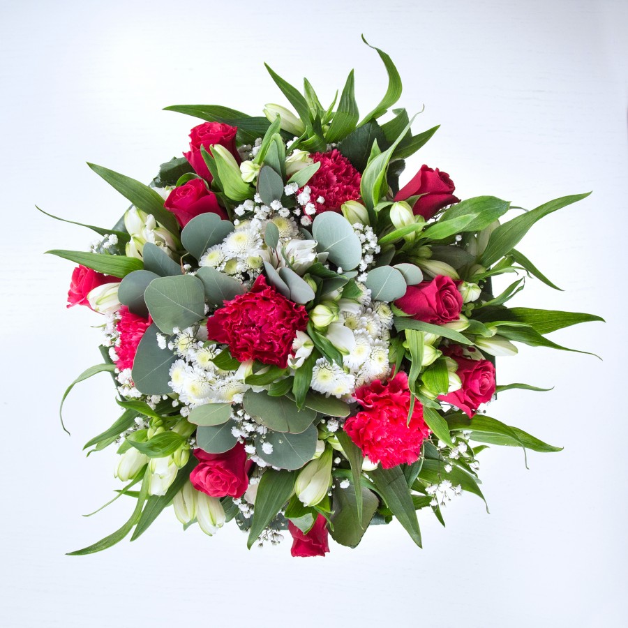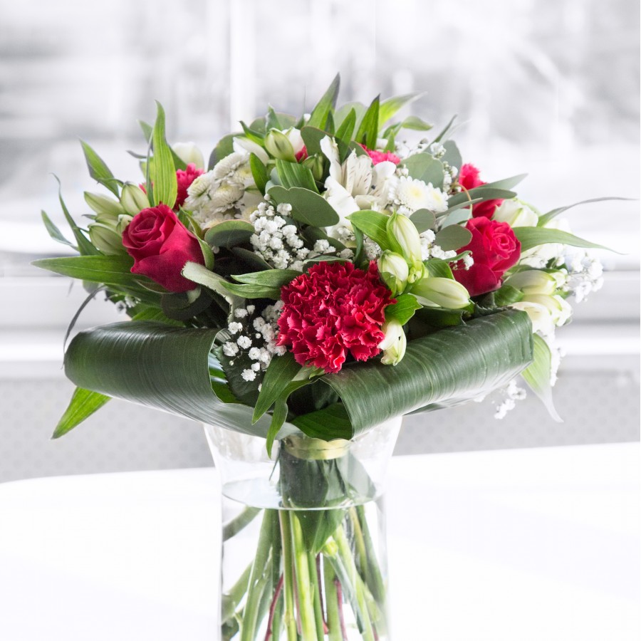 Celebrate with our unique and stunning flower arrangement. This bouquet features an exquisite combination of white chrysanthemums, airy gypsophila, passionate red roses, and elegant carnations, beautifully arranged with white alstroemeria and vibrant aspidistra leaves.